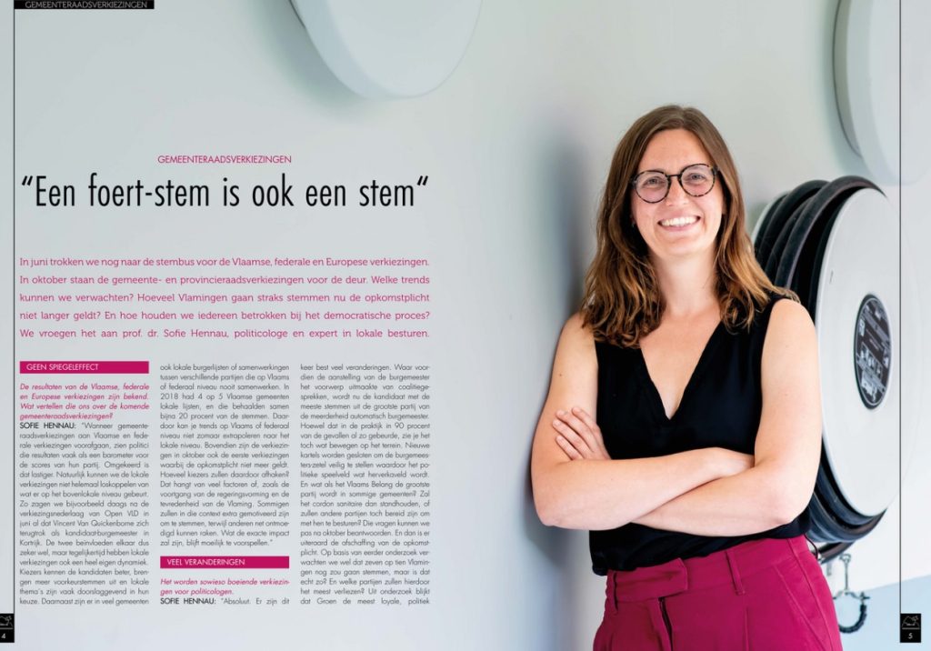 Interview met prof. dr. Sofie Hennau, politicologe en expert in lokale besturen (UHasselt), over de opkomstplicht, burgerberaden (waar nog steeds langopgeleide, oudere witte mannen in de meerderheid zijn) en de representatie van verschillende groepen, zoals jongeren, kortgeschoolden, minderheidsgroepen, mensen met lagere inkomens). Hennau let vooral op lokale bestuur: “Alle belangrijke globale thema´s worden echt tastbaar voor de burger op het lokale niveau. Bovendien fungeert het lokale niveau als broedplaats voor democratische innovaties en nieuwe burgerinitiatieven. We zien dat vele democratische vernieuwingen, zoals het vrouwenstemrecht destijds, eerst op gemeentelijk niveau werden geïntroduceerd. En gemeenten zijn vaak ook innovatiever in het ontwikkelen van beleid.”