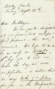 Maar op 18 augustus schreef Babbage aan Ada dat hij tekeningen en papieren mee zou nemen wanneer hij haar weer zou komen bezoeken. De week daarop schreef Ada aan Babbage: “We zijn erg blij met uw (enigszins onverwachte) voorstel” [voor een lang bezoek aan Ada en haar man]. En Ada schreef aan haar moeder: “Babbage en ik zijn volgens mij betere vrienden dan ooit. Ik heb hem nog nooit zo aardig, zo redelijk en zo opgewekt gezien!”