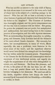 En Ada? Voor zover ik kan beoordelen, was ze iemand die duidelijk sprak en helder dacht. Ze kwam uit de hogere klasse, maar droeg geen bijzonder modieuze kleding en gedroeg zich veel minder als een stereotype gravin dan als een intellectueel. Als volwassene was ze emotioneel behoorlijk volwassen – waarschijnlijk meer dan Babbage – en leek ze een goed praktisch inzicht te hebben in mensen en de wereld.